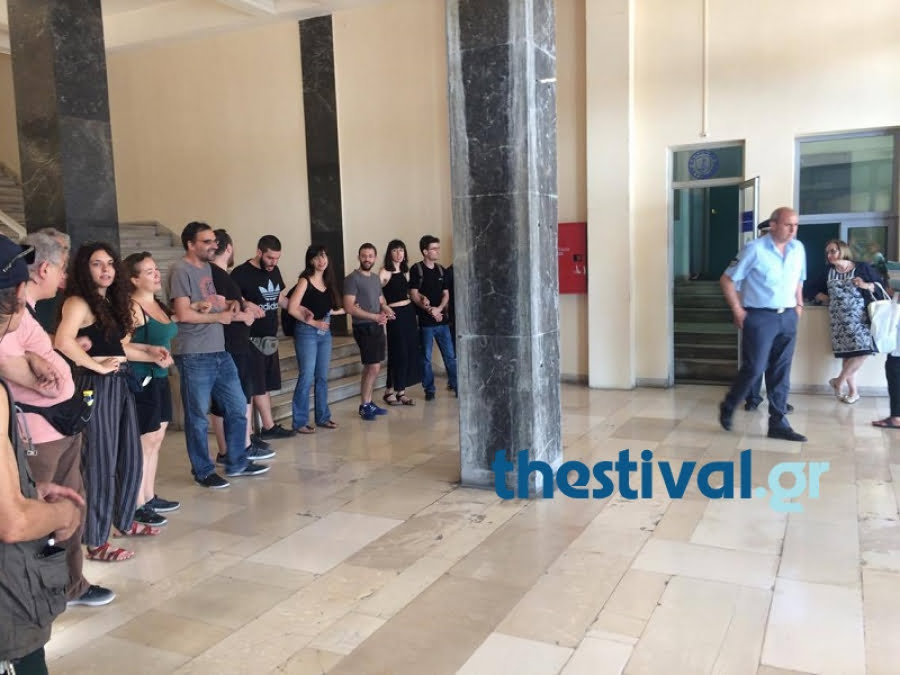 Τα μέλη του Συντονισμού έχουν σχηματίσει ανθρώπινη αλυσίδα έτσι ώστε να μην αφήσουν κανένα συμβολαιογράφο να εισέλθει στην αίθουσα.