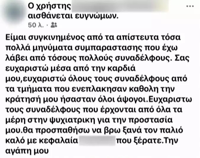 «Είμαι συγκινημένος από τα απίστευτα τόσα πολλά μηνύματα συμπαράστασης που έχω λάβει από τόσους πολλούς συναδέλφους. Σας ευχαριστώ μέσα από την καρδιά μου, ευχαριστώ όλους τους συναδέλφους από τα τμήματα που ενεπλάκησαν καθόλη την κράτησή μου, ήσασταν όλοι άψογοι. Ευχαριστώ τους συναδέλφους που έρχονται από όλα τα μέρη στην ψυχιατρική για την προστασία μου. Θα προσπαθήσω να βρω ξανά τον παλιό καλό με κεφαλαία… που ξέρατε. Την αγάπη μου» έγραψε αρχικά.