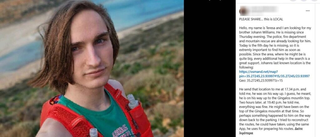 Η αδερφή του 21χρονου Γιόχαν, Τερέζα, προχώρησε σε μία ανάρτηση απευθύνοντας έκκληση σε όλους όσοι γνωρίζουν την περιοχή όπου εξαφανίστηκε ο Γερμανός τουρίστας να βοηθήσουν και να έρθουν σε επικοινωνία με τις αρχές.