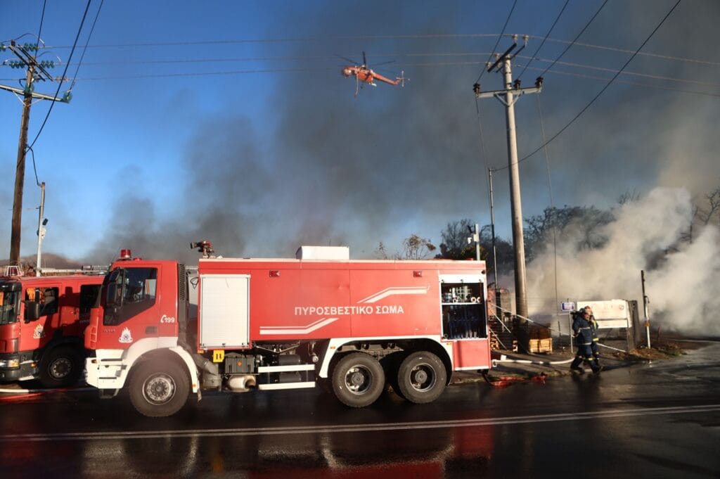 Σύμφωνα με την Πυροσβεστική η φωτιά εκδηλώθηκε γύρω στις 17.16 σε υπαίθριο χώρο με ξύλα και παλέτες και στο σημείο επιχειρούν 44 πυροσβέστες με 20 οχήματα και 3 ελικόπτερα.