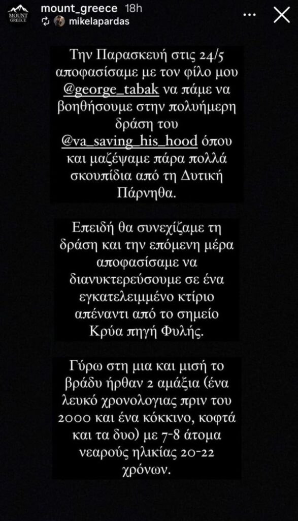Όπως περιγράφουν οι ίδιοι οι πρωταγωνιστές της υπόθεσης, την Παρασκευή αποφάσισαν να βοηθήσουν την δράση της οργάνωσης VA Saving his Hood μαζεύοντας πολλά σκουπίδια από την Δυτική Πάρνηθα. Η δράση επρόκειτο να συνεχίσει και την επόμενη ημέρα και έτσι κάποιοι αποφάσισαν να διανυκτερεύσουν σε ένα εγκαταλελειμμένο κτίριο απέναντι από το σημείο Κρύα Πηγή Φυλής.