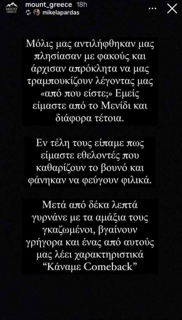 Όπως γράφει το protothema.gr, περίπου στη 01:30, δυο αμάξια με 7-8 νεαρούς έφτασαν στο σημείο. Όταν οι νεαροί αντιλήφθηκαν τους κατασκηνωτές, τους πλησίασαν με φακούς και τους τραμπούκισαν ρωτώντας: «Από που είστε; Εμείς είμαστε από το Μενίδι». Όταν τους εξήγησαν ότι είναι εθελοντές που καθαρίζουν το βουνό, οι άγνωστοι έφυγαν. Μετά από 10 λεπτά όμως, επέστρεψαν με αυτοκίνητα και όπως λέει ένα από τα θύματα της επίθεσης φώναζαν «Κάναμε Comeback».