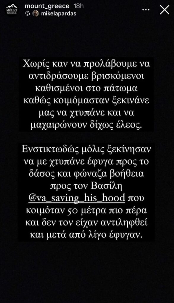 «Δεν μπορούσαμε να αντιδράσουμε γιατί ήμασταν στο πάτωμα ξαπλωμένοι και έτσι ξεκίνησαν να μας χτυπάνε και να μαχαιρώνουν δίχως έλεος» λέει θύμα της επίθεσης και συμπληρώνει πως πριν καλά-καλά προλάβουν να αντιδράσουν, είχαν φύγει.