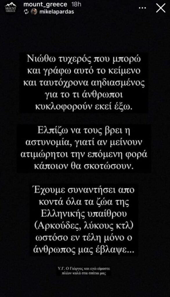 Η ανάρτηση καταλήγει με τον εθελοντή να λέει «Έχουμε συναντήσει από κοντά όλα τα ζώα της ελληνικής υπαίθρου (αρκούδες, λύκους κτλ) ωστόσο εν τέλει μόνο ο άνθρωπος μας έβλαψε».