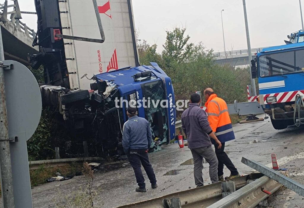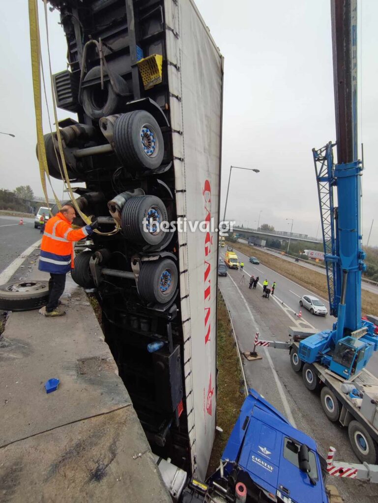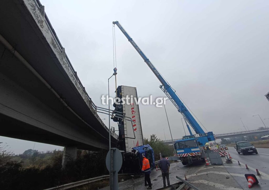 Θεσσαλονίκη: Επιχείρηση ανάσυρσης της νταλίκας με πινακίδες Τουρκίας που έπεσε από γέφυρα (φωτο)
