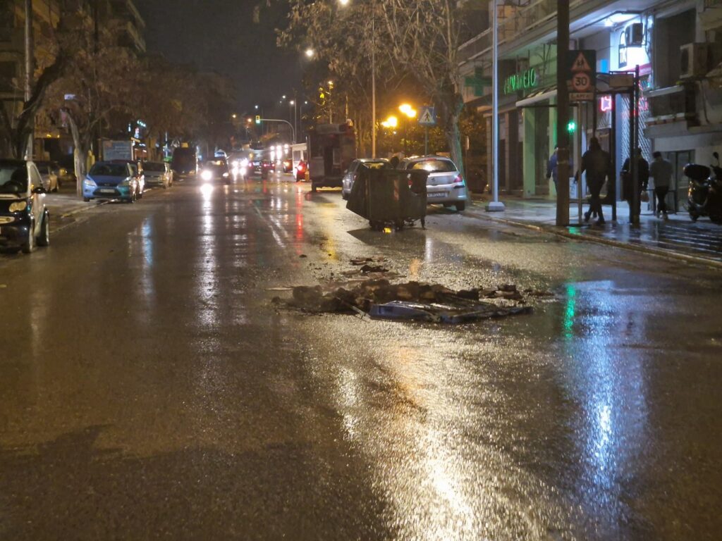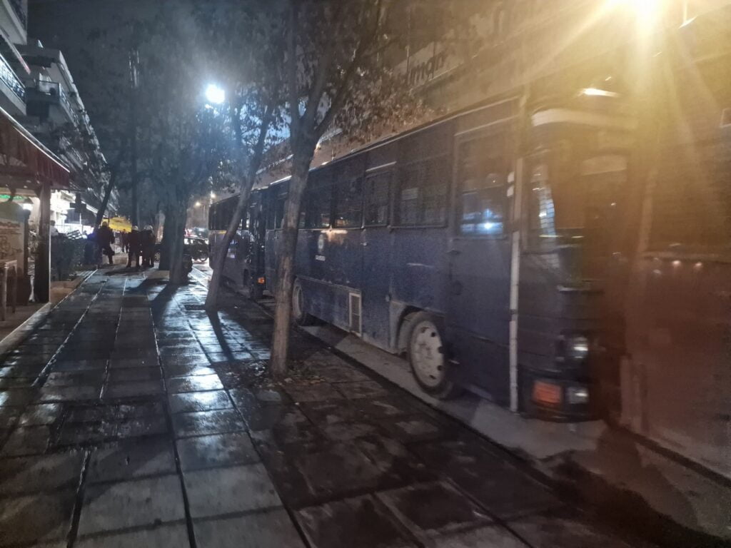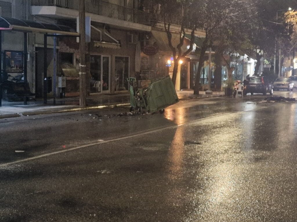 Οι ταραξίες απωθήθηκαν από διμοιρίες των ΜΑΤ και στη συνέχεια πυρπόλησαν κάδους απορριμμάτων στήνοντας οδοφράγματα.