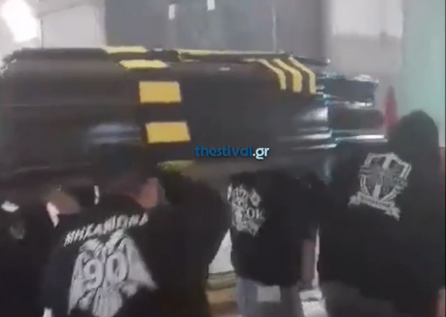 Στην ιχθυόσκαλα της Νέας Μηχανιώνας, φίλοι του ΠΑΟΚ έκαναν την “κηδεία” του Άρη, με όλα τα απαραίτητα, για να κάνουν καζούρα στους “κιτρινόμαυρους”.