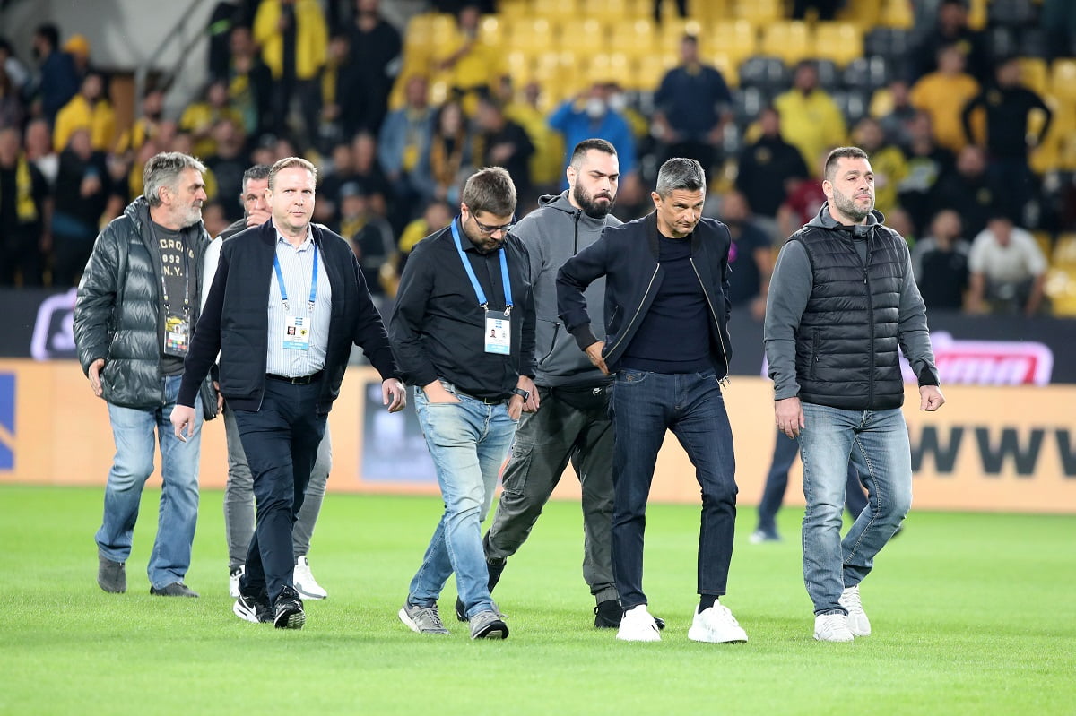 Ο Ρουμάνος τεχνικός έκανε τον καθιερωμένο περίπατο στον αγωνιστικό χώρο, με τους οπαδούς της ΑΕΚ να τον αποδοκιμάζουν και τους ανθρώπους της Ένωσης να του ζητούν να μην πάει προς το πέταλο των οργανωμένων οπαδών.
