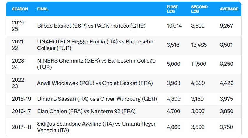 Ιστορικοί αποδείχθηκαν οι φετινοί τελικοί του FIBA Europe Cup, όχι μόνο για την εξέλιξη στο παρκέ, αλλά και για την εντυπωσιακή παρουσία του κόσμου στις εξέδρες. Η Μπιλμπάο και ο ΠΑΟΚ προσέφεραν μια ανεπανάληπτη μπασκετική γιορτή, σπάζοντας το ρεκόρ συνολικής προσέλευσης φιλάθλων στους τελικούς της διοργάνωσης.