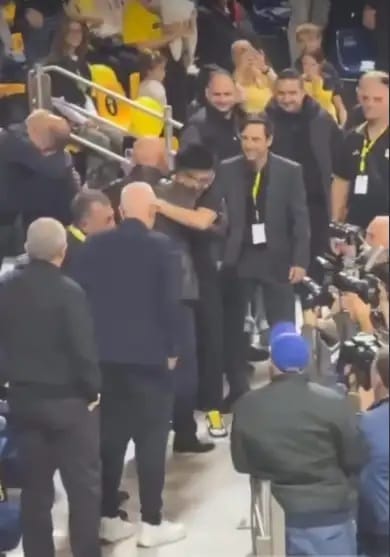 Ο Ρίτσαρντ Σιάο κατά την είσοδό του στο παρκέ πήγε κατευθείαν στις εξέδρες που ήταν ο Νίκος Γκάλης για να τον χαιρετήσει και να τον αγκαλιάσει στην πρώτη τους κοινή παρουσία στο γήπεδο του Άρη Betsson.