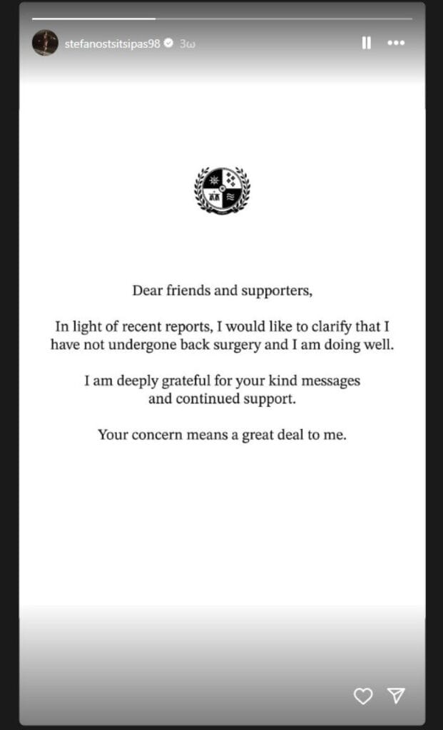 «Αγαπητοί φίλοι και υποστηρικτές, με αφορμή τα τελευταία δημοσιεύματα, θα ήθελα να διευκρινίσω ότι δεν έχω υποβληθεί σε επέμβαση στην πλάτη και πως αισθάνομαι καλά. Είμαι βαθύτατα ευγνώμων για τα ευγενικά σας μηνύματα και τη διαρκή υποστήριξη. Το ενδιαφέρον σας σημαίνει πολλά για εμένα», έγραψε ο Έλληνας τενίστας σε ανάρτησή του.