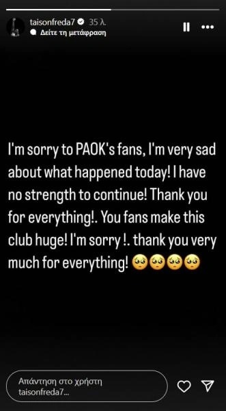 «Ζητάω συγγνώμη από τους οπαδούς του ΠΑΟΚ, είμαι πολύ λυπημένος για αυτό που συνέβη σήμερα! Δεν έχω την δύναμη να συνεχίσω, σας ευχαριστώ για όλα! Εσείς οι οπαδοί κάνετε αυτόν τον σύλλογο τεράστιο! Συγγνώμη! Σας ευχαριστώ πολύ για όλα», ανέφερε ο Τάισον.