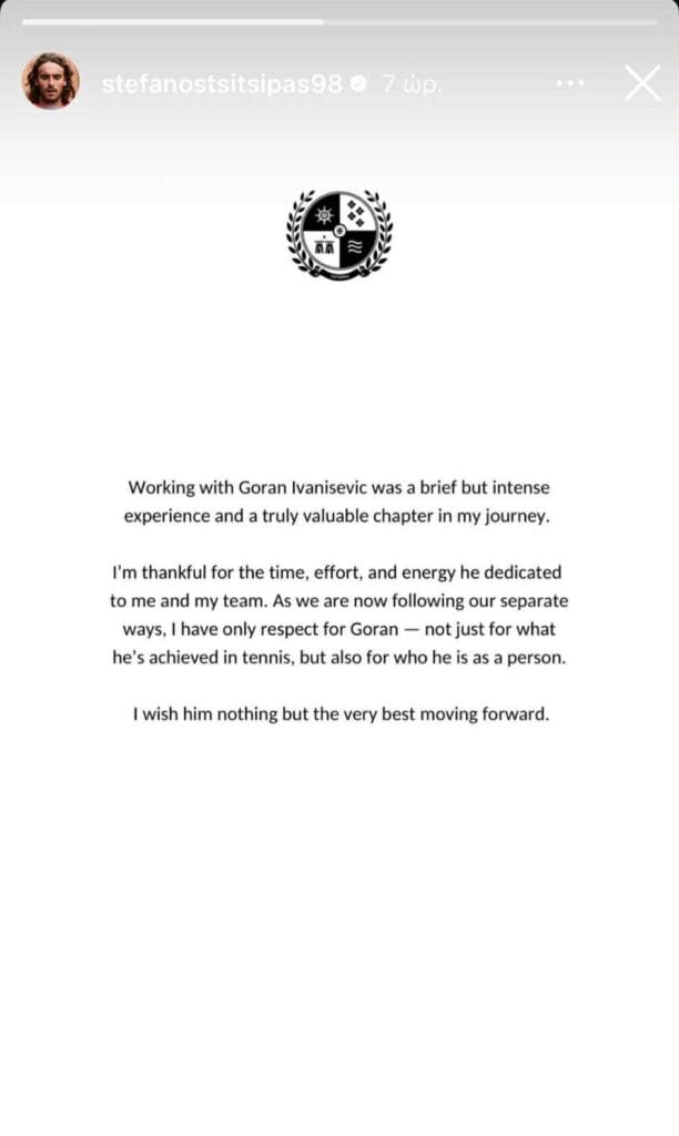 Την λύση της συνεργασίας έκανε γνωστή ο Στέφανος Τσιτσιπάς με ανακοίνωσή του στα social media.