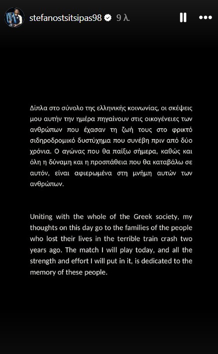 “Δίπλα στο σύνολο της ελληνικής κοινωνίας, οι σκέψεις μου αυτή την ημέρα πηγαίνουν στις οικογένειες των ανθρώπων που έχασαν τη ζωή τους στο φρικτό σιδηροδρομικό δυστύχημα που συνέβη πριν από δύο χρόνια. Ο αγώνας που θα παίξω σήμερα, καθώς και όλη η δύναμη και η προσπάθεια που θα καταβάλω σ’ αυτόν, είναι αφιερωμένα στη μνήμη αυτών των ανθρώπων”, έγραψε ο Στέφανος Τσιτσιπάς στην ανάρτησή του.