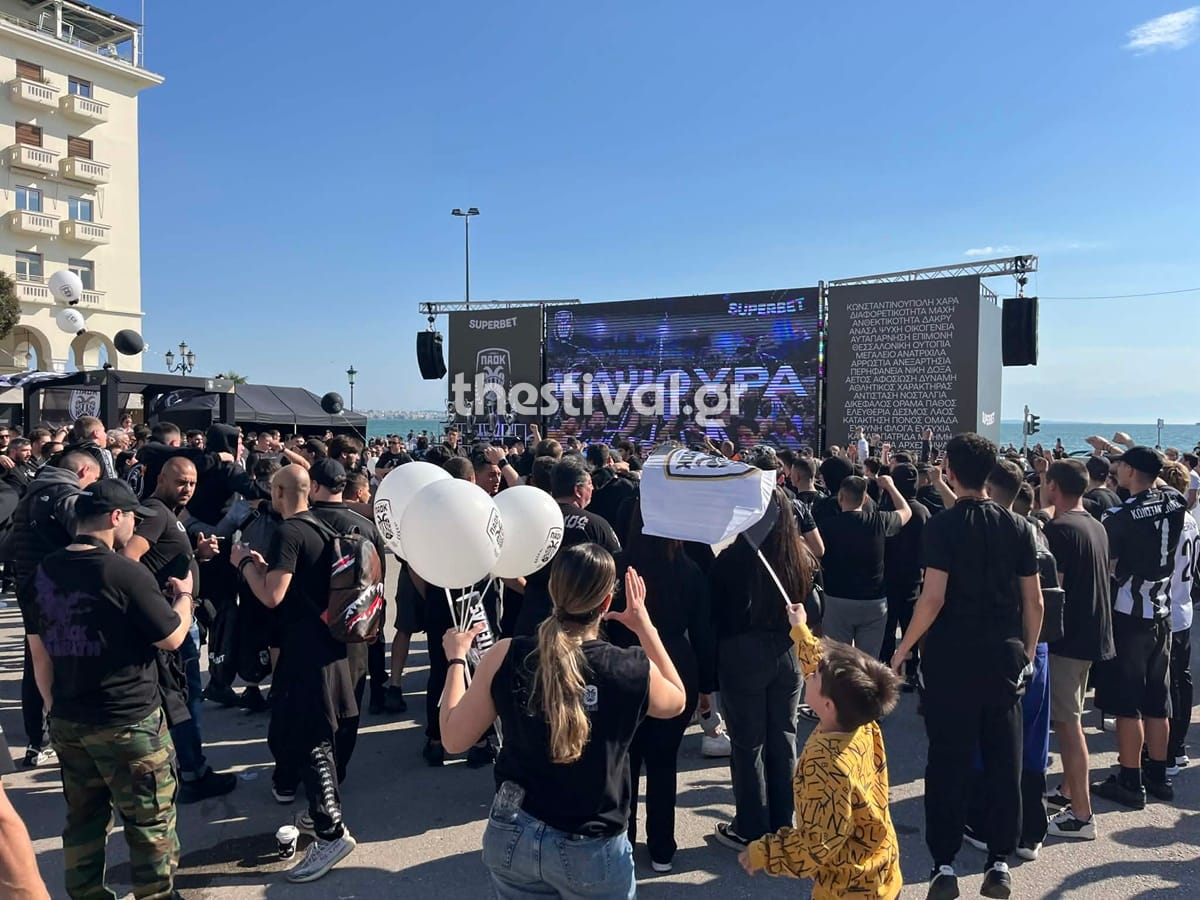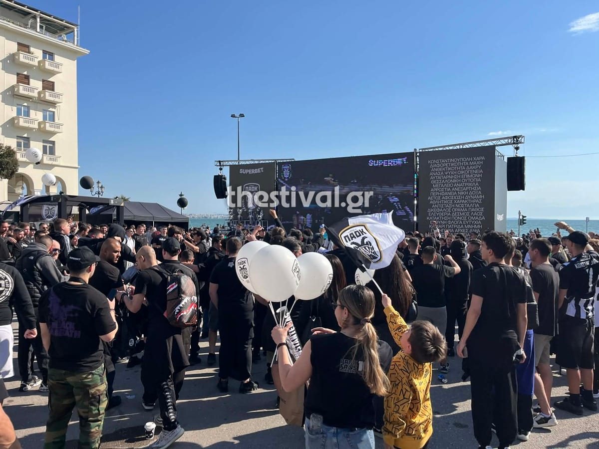 Με αφορμή τα σημερινά γενέθλια του ΠΑΟΚ, δεκάδες οπαδοί δίνουν το παρών στην εορταστική εκδήλωση που έχει στηθεί στο κέντρο της πόλης. Φωνάζοντας συνθήματα της αγαπημένης τους ομάδας και κρατώντας σημαίες και καπνογόνα, οι φίλοι του ΠΑΟΚ ζουν έντονα τη σημερινή επετειακή μέρα του «Δικεφάλου του Βορρά».