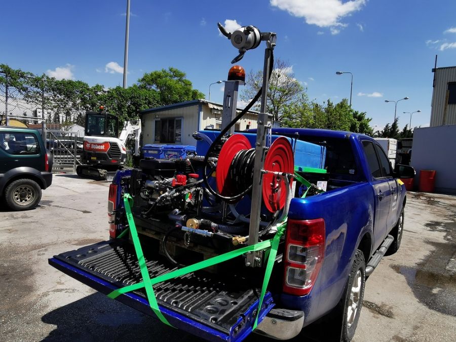 Το παρελκόμενο τοποθετείται σε ισχυρό πλαίσιο με κατάλληλες υποδοχές για την γρήγορη και ασφαλή σύμπλεξη και αποσύμπλεξη στο οπίσθιο μέρος του οχήματος φορέα και αποτελείται από αντλία υψηλής πίεσης, μεμβρανών, με παροχή μέχρι 40 l/min και πίεση τουλάχιστον 40 bar η οποία παίρνει κίνηση από ανεξάρτητο κινητήρα, τυλιχτήρα με λάστιχο μήκους 20 m εξοπλισμένο με πιστόλι χειρός με μπεκ νεφέλωσης για μακρά διασπορά καθώς και δεύτερο λάστιχο 10 m με ακροφύσιο με μπεκ νεφέλωσης για κοντινές αποστάσεις. Επίσης στο πίσω μέρος υπάρχει τριπλό, περιστρεφόμενο μπεκ νεφέλωσης, στερεωμένο σε βάση με δυνατότητα ρύθμισης του ύψους εργασίας για τον ψεκασμό εν κινήσει και δοχείο νερού – διαλύματος, χωρητικότητας τουλάχιστον 500 λίτρων κατάλληλο για αυτονομία τουλάχιστον 15 λεπτών, με ανοιγόμενο καπάκι για την πλήρωση καθώς και σύστημα ανάδευσης του υγρού για συνεχόμενη ανάμειξη των υλικών.
