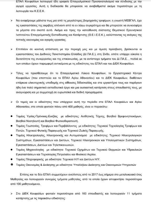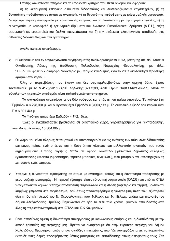Ο Δήμαρχος Χαλκηδόνος στην επιστολή παραθέτει στοιχεία, που τεκμηριώνουν πλήρως το αίτημα του Δήμου. Όπως αναφέρει, υπάρχει το κατάλληλο εκπαιδευτικό κτίριο, το οποίο αυτή τη στιγμή στεγάζει αποκλειστικά και μόνο, το Επαγγελματικό Λύκειο Κουφαλίων, το Εργαστηριακό Κέντρο Κουφαλίων και το ΔΙΕΚ Κουφαλίων, ενώ υπάρχει στο χώρο και η υποδομή της Επαγγελματικής Σχολής Κουφαλίων, που έχει διακόψει τη λειτουργία της. Επομένως καλύπτονται πλήρως οι προϋποθέσεις των υφιστάμενων δομών που πρέπει να λειτουργούν στο χώρο. Το Εργαστηριακό Κέντρο μάλιστα καλύπτει και το δεύτερο ΕΠΑΛ του Δήμου μας, το ΕΠΑΛ Αγίου Αθανασίου.