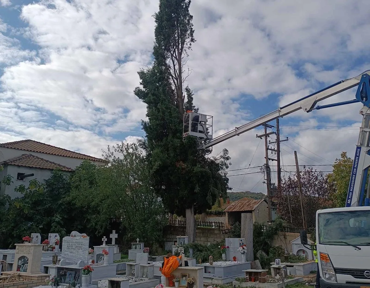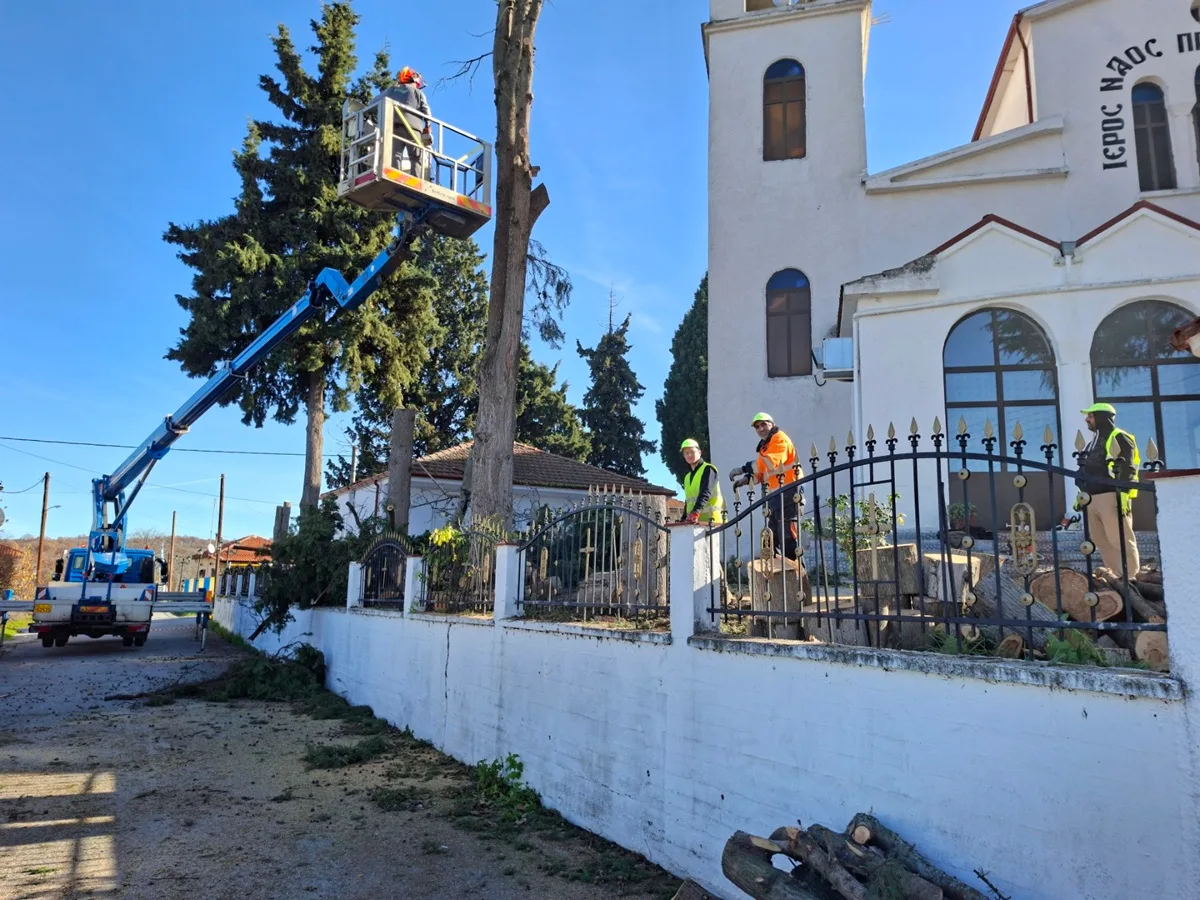 Οι εργασίες περιλάμβαναν κοπές επικίνδυνων δέντρων, εκτεταμένα κλαδέματα για αποφόρτιση και σταθεροποίηση, καθώς και απομάκρυνση επικίνδυνων τμημάτων, με στόχο την πρόληψη ατυχημάτων και την αποκατάσταση της λειτουργικότητας των χώρων.