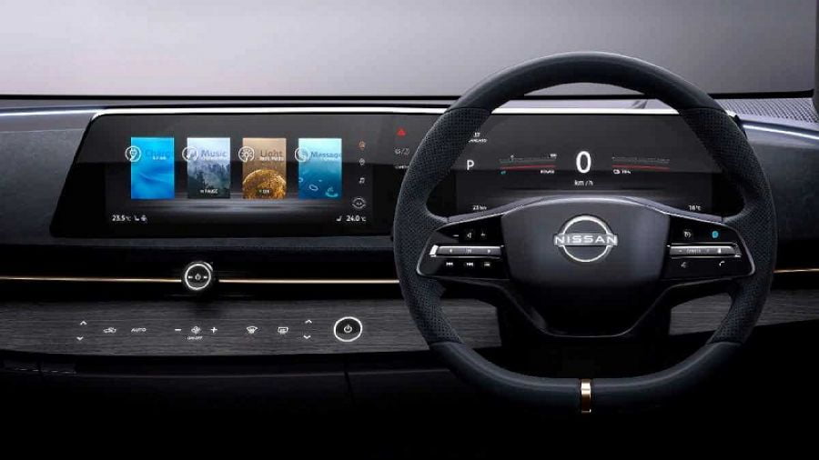 Η Nissan επέλεξε μια διαφορετική πορεία κατά την ανάπτυξη της οθόνης του Nissan Ariya Concept, δίνοντας προτεραιότητα στο σχεδιασμό, οραματιζόμενη τις τελευταίες τάσεις. Αντί ενός tablet, το ηλεκτρικό crossover έχει μια καμπυλοειδή διπλή οθόνη που θυμίζει κύμα. Προφέρει την αίσθηση του “ορίζοντα” σε όλο το αυτοκίνητο, σε συνδυασμό με το διάκοσμο από τις πόρτες, μέχρι το πίσω μέρος της καμπίνας.