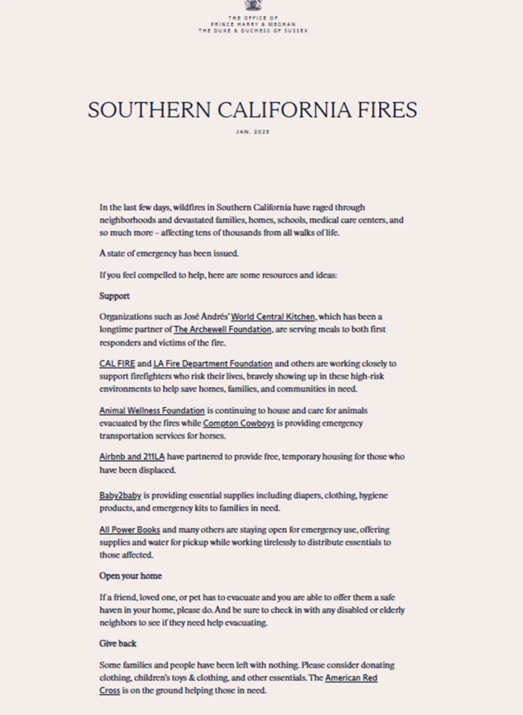 Το ζευγάρι, που έχει εγκατασταθεί μόνιμα στην περιοχή, δήλωσε αλληλέγγυο στους πολίτες του Λος Άντζελες, οι οποίοι έχουν αναγκαστεί να εγκαταλείψουν τα σπίτια τους λόγω της πύρινης λαίλαπας. Σε δήλωσή τους στην ιστοσελίδα Sussex.com, κάλεσαν τους κατοίκους να προσφέρουν βοήθεια και να ακολουθήσουν το παράδειγμά τους προσφέροντας ασφαλή καταφύγιο σε όσους το χρειάζονται.