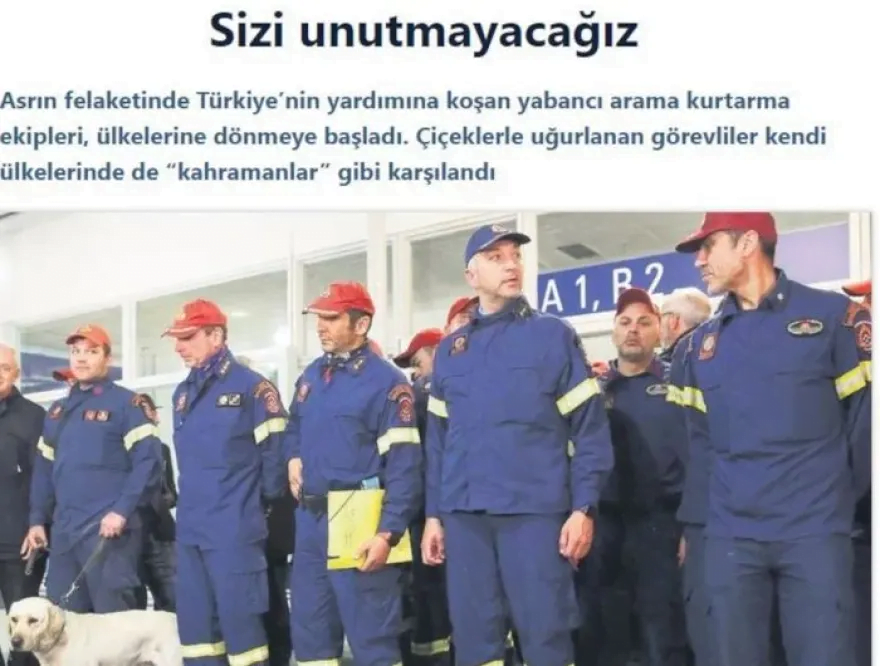 «Δεν θα σας ξεχάσουμε», είναι το «ευχαριστώ» της εφημερίδας Sabah που με τη δική της σειρά εκφράζεται με πολύ θερμά λόγια, για το τιτάνιο έργο των Ελλήνων διασωστών.