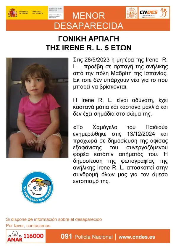 Συναγερμός έχει σημάνει μέσω του συνεργαζόμενου φορέα του «Χαμόγελου του Παιδιού» στην Ισπανία για την αρπαγή και εξαφάνιση της 5χρονης Irene R.L από τη Μαδρίτη.