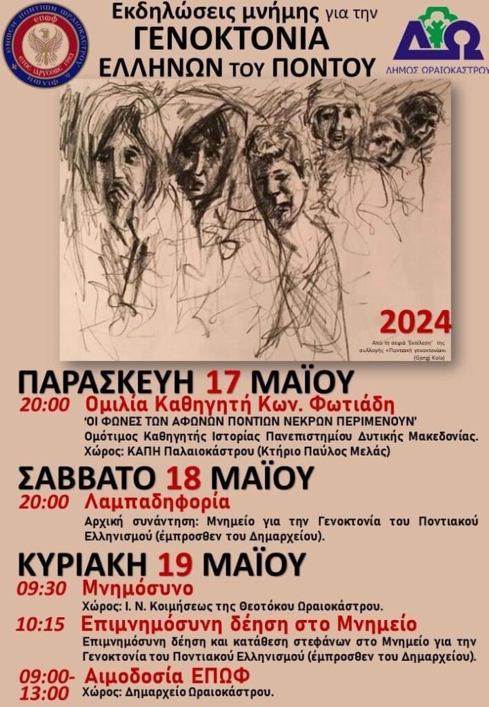 Εκδηλώσεις μνήμης για την 19η Μαΐου, Ημέρα Μνήμης της Γενοκτονίας των Ελλήνων του Πόντου, θα πραγματοποιηθούν στο Ωραιόκαστρο από τον δήμο Ωραιοκάστρου και την Ένωση Ποντίων Ωραιοκάστρου και Φίλων (ΕΠΩΦ).