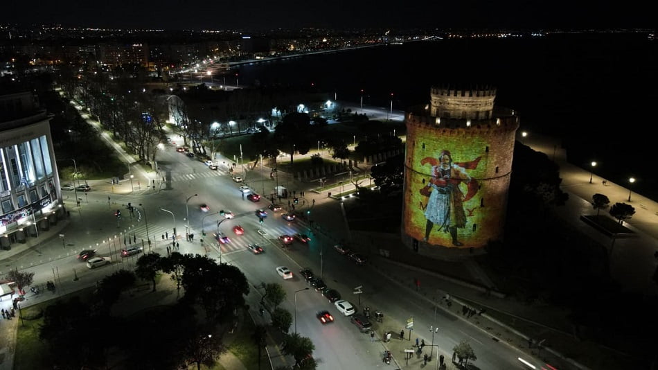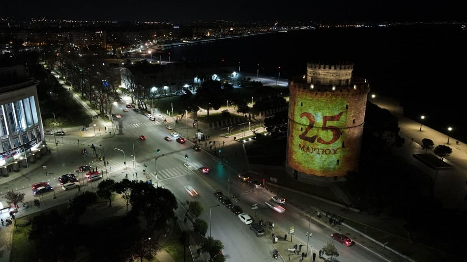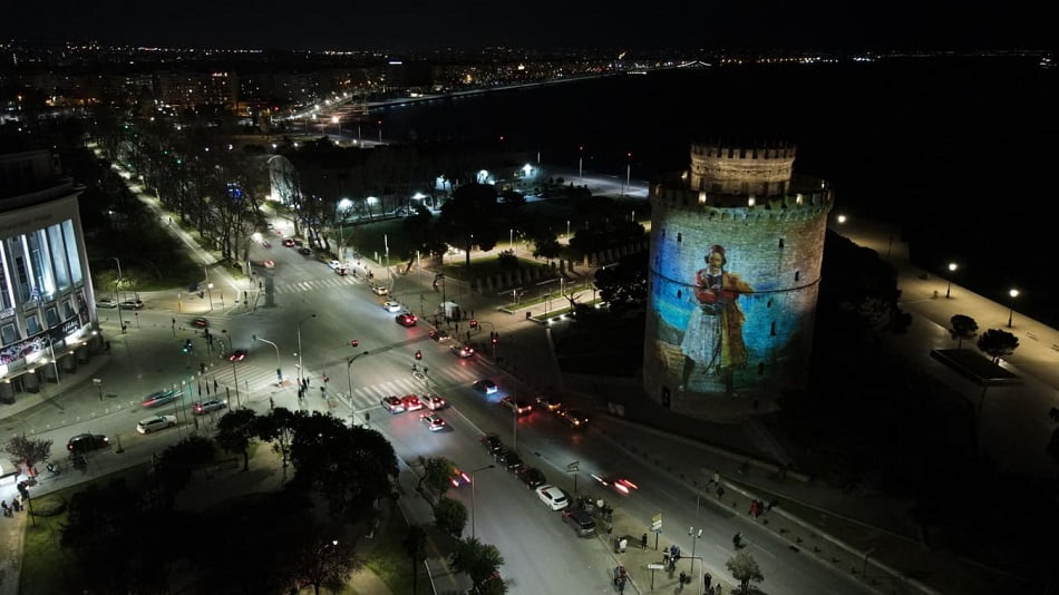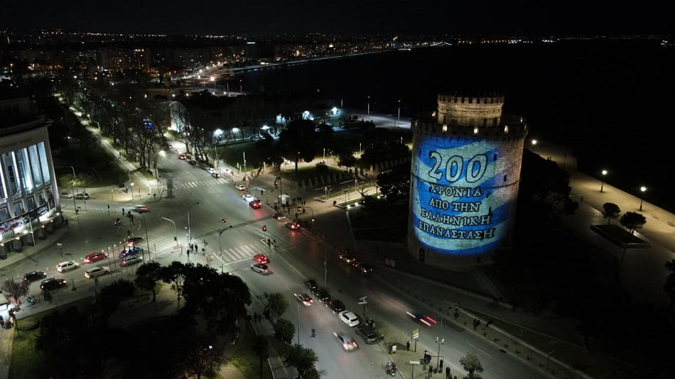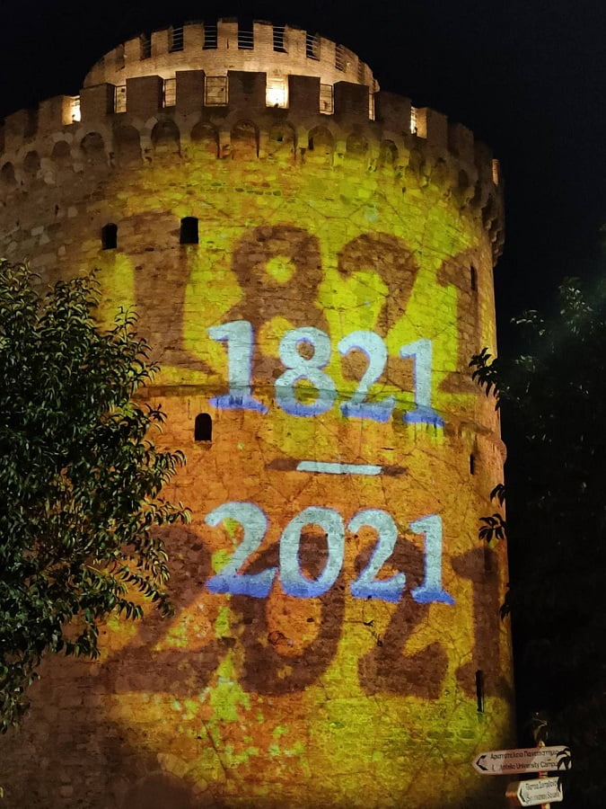Στην επιφάνεια του Λευκού Πύργου ζωντάνεψε η μορφή του «Έλληνα Αγωνιστή» από το έργο του Ιταλού ζωγράφου Λουντοβίκο Λιπαρίνι, αποτυπώθηκαν οι στίχοι “Η δύναμή σου πέλαγο, η θέλησή μου βράχος” από τους Ελεύθερους Πολιορκημένους του Διονύσιου Σολωμού, προβλήθηκαν οι χρονολογίες “1821-2021” και με φόντο τη γαλανόλευκη σημαία το μήνυμα “200 χρόνια από την Ελληνική Επανάσταση”.