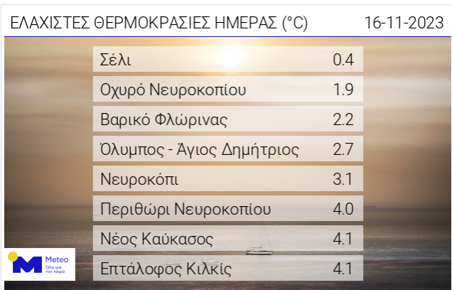 Η χαμηλότερη ελάχιστη καταγράφηκε στο Σέλι, όπου ο υδράργυρος έπεσε στους 0.4 °C.