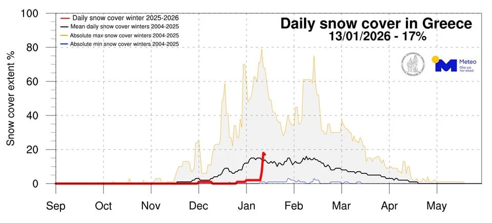 Η σύγκριση με την κλιματολογία δείχνει ότι ο χειμώνας 2025–2026 χαρακτηρίζεται έως τώρα από περιορισμένη χιονοκάλυψη, παρουσιάζει όμως σαφή τάση αύξησής της σε σχέση με έναν «μέσο» ελληνικό χειμώνα, ιδιαίτερα αν ληφθούν υπόψη και τα προγνωστικά στοιχεία των επόμενων ημερών, που υποδεικνύουν νέες χιονοπτώσεις σε ορεινά και ημιορεινά τμήματα.