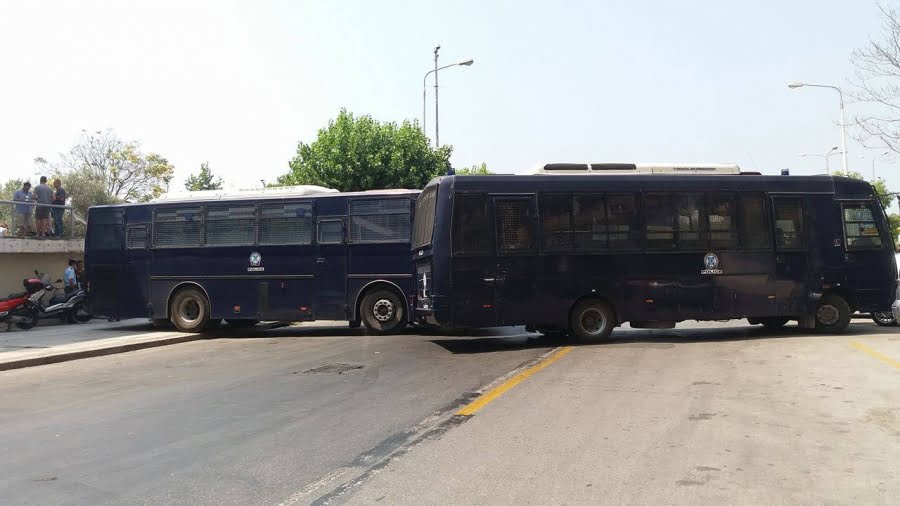 Ο δρόμος μπροστά από το δικαστικό μέγαρο είναι κλειστός, ενώ στο σημείο έχουν τοποθετηθεί και δύο κλούβες της αστυνομίας.
