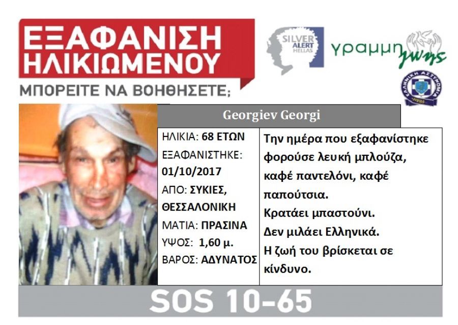 Συγκεκριμένα, ο 68χρονος έχει έρθει από τη Βουλγαρία στις 24/09/2017 και φιλοξενούνταν προσωρινά στις Συκιές Θεσσαλονίκης, σε σπίτι φίλου του. Την 01/10/2017, εξαφανίσθηκε από το σπίτι στο οποίο φιλοξενούνταν και έκτοτε δεν είχε δώσει σημεία ζωής.