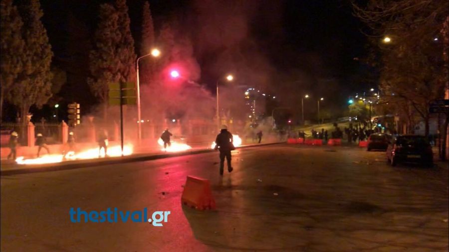 Άτομα που συμμετείχαν στην πορεία για την επέτειο των εννέα χρόνων από τη δολοφονία του Αλέξανδρου Γρηγορόπουλου, κινήθηκαν από την Καμάρα στον χώρο των πανεπιστημίων, από όπου και άρχισαν πριν από περίπου ένα τέταρτο να πετάνε βόμβες μολότοφ και πέτρες προς τις αστυνομικές δυνάμεις που βρίσκονται παραταγμένες στην Αγίου Δημητρίου.