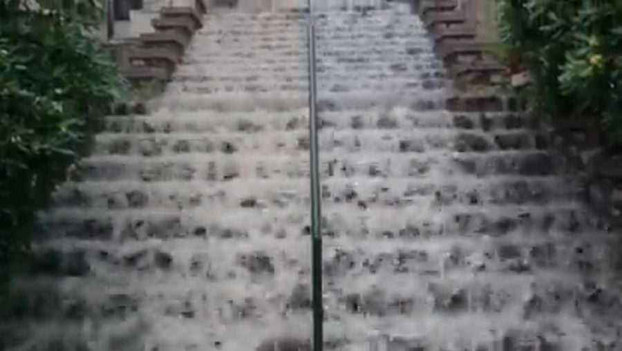 Τα σκαλοπάτια της οδού Βλατάδων μετατράπηκαν σε “καταρράκτη”, καθώς φάινεται πως τα φρεάτια δεν μπόρεσαν να απορροφήσουν τον μεγάλο όγκο του νερού.