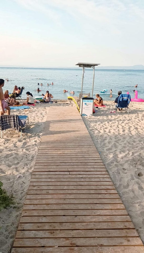 Όπως φαίνεται και στην παρακάτω φωτογραφία από την “Εφημερίδα Κασσάνδρα”, ειδική ράμπα για ΑμεΑ, προκειμένου να μπαίνουν στη θάλασσα και να απολαμβάνουν το μπάνιο τους, τοποθετήθηκε στην παραλία του Πευκοχωρίου, στη Χαλκιδική.