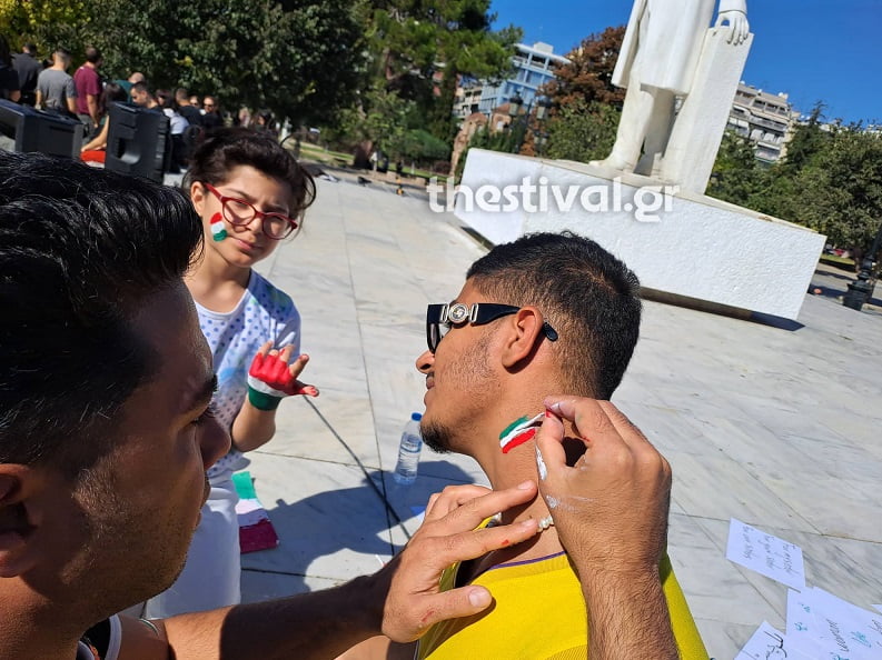 Σε ένδειξη συμπαράστασης, πολίτες από το Ιράν βάφουν με τα χρώματα της σημαίας της χώρας τους όσους από τους συγκεντρωμένους το επιθυμούν.