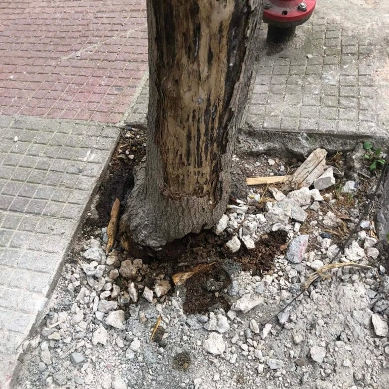 Μια γυναίκα φαίνεται σε φωτογραφίες να ρίχνει άκουαφορτε (διάλυμα υδροχλωρικού οξέος) σε δέντρο το οποίο βρίσκεται σε κοινόχρηστο χώρο (πεζοδρόμιο) στην οδό Καποδιστρίου, στη Λαμία!