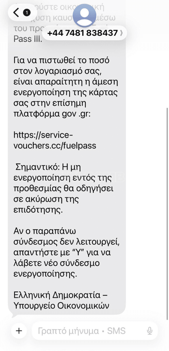 Συγκεκριμένα, τα μηνύματα αποστέλλονται από 12ψήφιο αριθμό, όπως ο 447481838437, και εμφανίζονται ως δήθεν επίσημη ειδοποίηση από το gov.gr. Οι αποδέκτες ενημερώνονται ότι δικαιούνται οικονομική ενίσχυση καυσίμων μέσω του υποτιθέμενου «Fuel Pass III» και καλούνται να ενεργοποιήσουν άμεσα την κάρτα τους μέσω συνδέσμου.