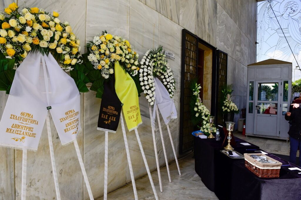 Στεφάνια για τον Νίκο Ξανθόπουλο έστειλαν η υπουργός Πολιτισμού, Λίνα Μενδώνη, καλλιτέχνες, η ΑΕΚ, της οποίας ο ηθοποιός ήταν μεγάλος οπαδός κ.α.