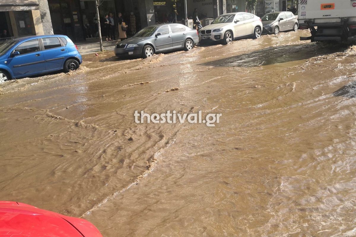 Σε ποτάμι έχει μετατραπεί η οδός 26ης Οκτωβρίου, στο ύψος του Δικαστικού Μεγάρου Θεσσαλονίκης.