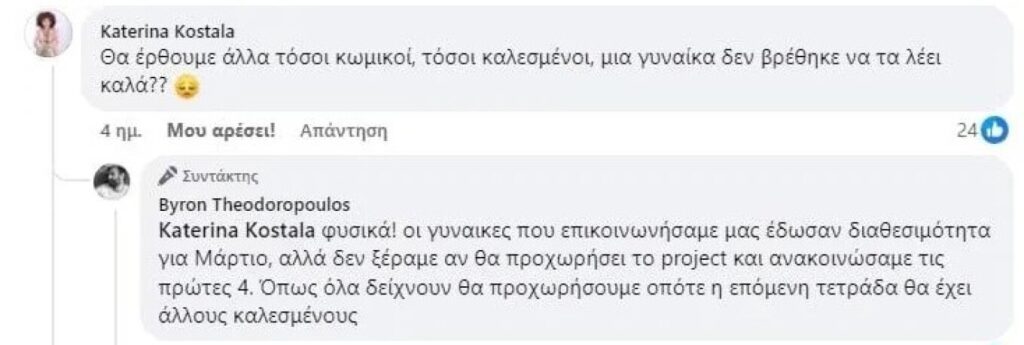 Δηλώνουμε ότι καμία γυναίκα κωμικός δεν έλαβε συγκεκριμένη πρόταση με ημερομηνίες, πριν την ανακοίνωση της παράστασης.