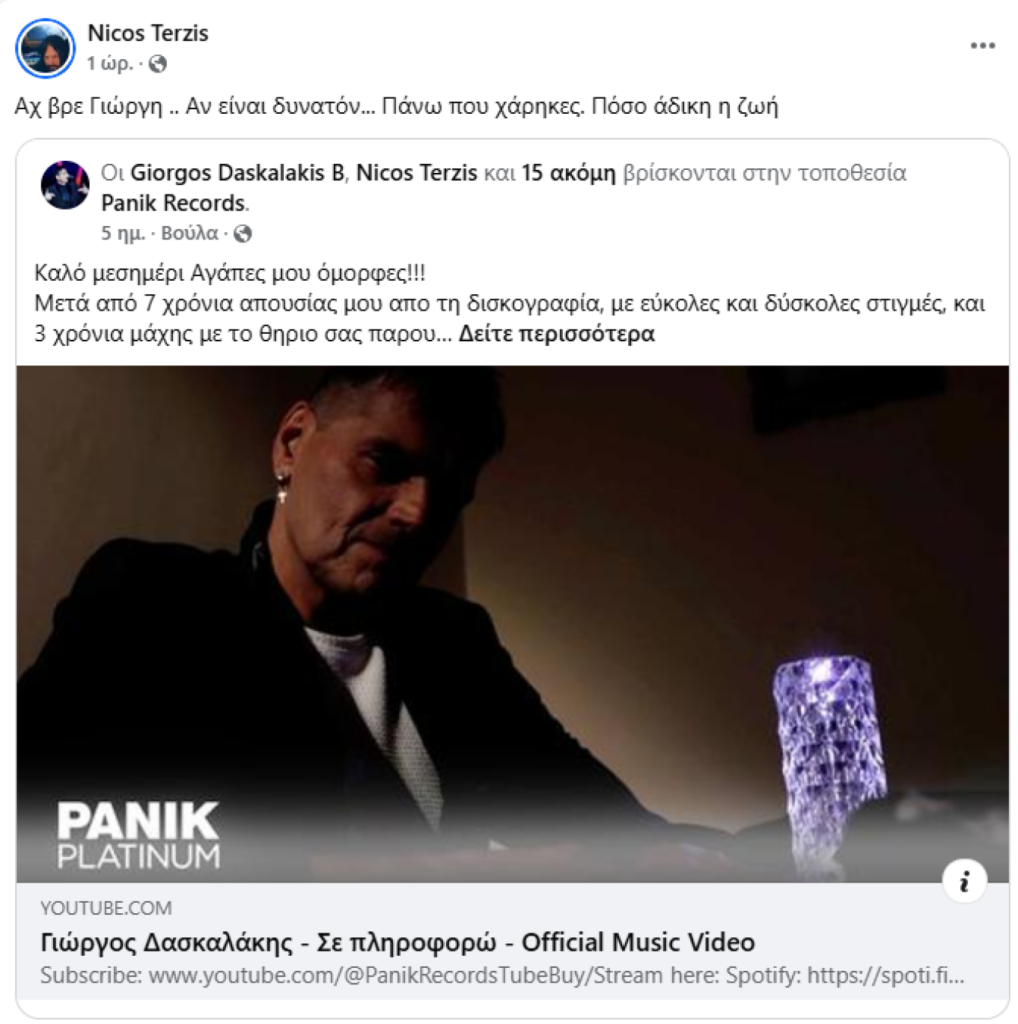 «Αχ βρε Γιώργη .. Αν είναι δυνατόν… Πάνω που χάρηκες. Πόσο άδικη η ζωή» έγραψε στην ανάρτησή του ο Νίκος Τερζής.