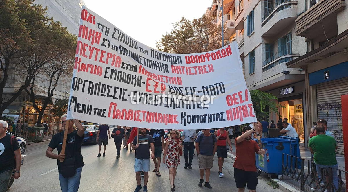 Η πορεία ξεκίνησε από το άγαλμα Βενιζέλου και μέσω της Αριστοτέλους έφτασε έξω από το Αμερικανικό Προξενείο, όπου αυτήν την ώρα οι συμμετέχοντες στη διαμαρτυρία φωνάζουν συνθήματα κατά του ΝΑΤΟ και υπέρ της Παλαιστίνης.