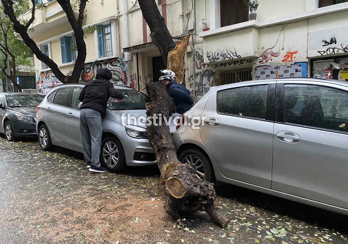 Πτώσεις δέντρων λόγω των ισχυρών ανέμων στο κέντρο της Θεσσαλονίκης – Ζημιές σε αυτοκίνητα (φωτο & video)