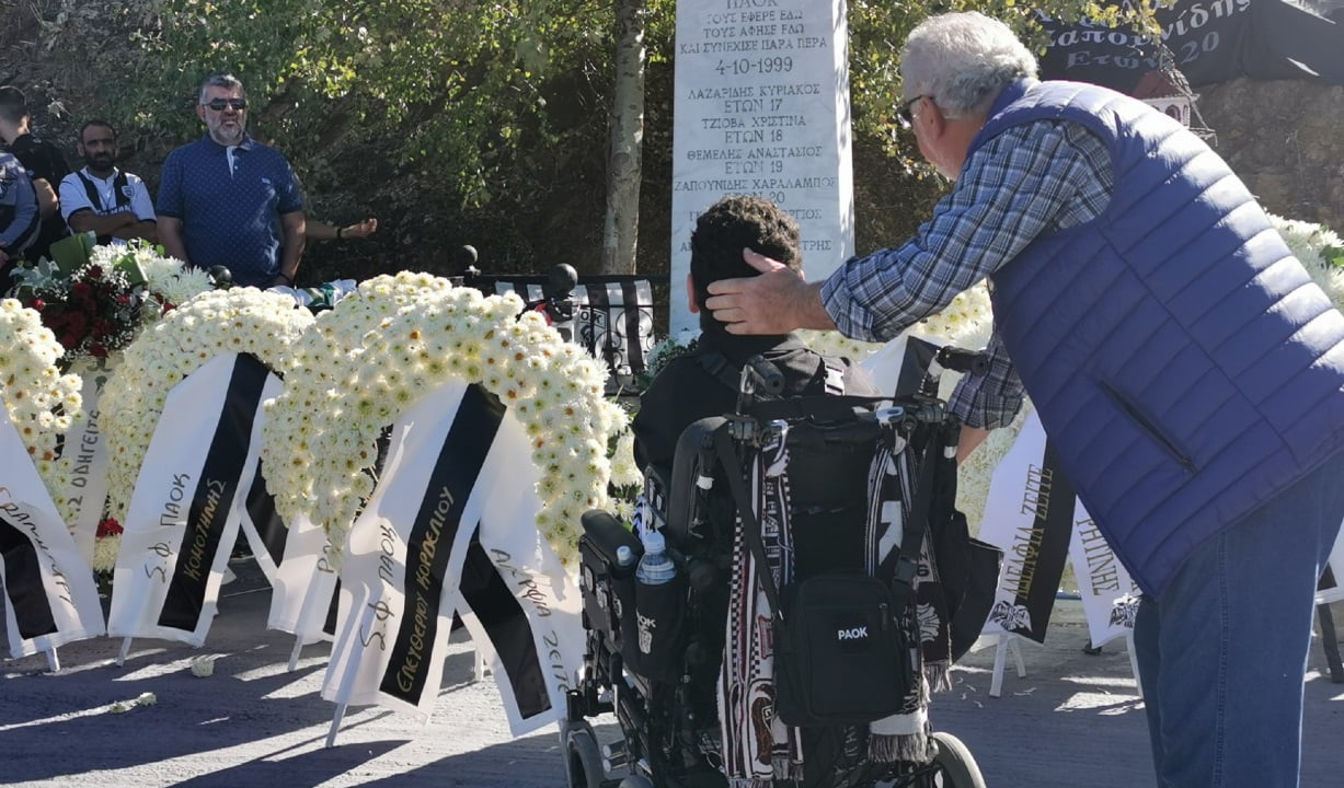 Χαράλαμπε, Δημήτρη, Χριστίνα, Αναστάσιε, Γιώργο, Κυριάκο η αγάπη σας για τον ΠΑΟΚ σας έφερε εδώ, σας άφησε εδώ, συνέχισε παραπέρα και αποτέλεσε παράδειγμα αφοσίωσης και πίστης στα τέσσερα γράμματα για όσους κάθονται δίπλα στις θέσεις σας, θυμούνται τις εκδρομές σας και δακρύζουν όταν γυρίζουν σ΄ εκείνο το δύσκολο βράδυ του Οκτωβρίου του ‘99. Η αγαπημένη συνήθεια, ο εθισμός στην λατρεία του Δικεφάλου, σας οδήγησε να ανεβείτε τις σκάλες του διώροφου πούλμαν που θα σας πήγαινε στο ΟΑΚΑ για το ματς με τον Παναθηναϊκό στις 3 Οκτωβρίου. Και πήγατε, φωνάξατε, πανηγυρίσατε το γκολ του Νάγκμπε για το 1-1 και βολευτήκατε στις θέσεις σας για το ταξίδι της επιστροφής.