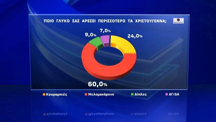 Η δημοσκόπηση της Opinion Poll για το Action24 επιχειρεί να δώσει απαντήσεις στα γιορτινά ερωτήματα, λίγες ημέρες πριν τα Χριστούγεννα. Για αρχή, τα μελομακάρονα φαίνεται πως κερδίζουν κατά κράτος, αφού συγκεντρώνουν ποσοστό 60%, την ώρα που ο κουραμπιές περιορίζεται στο 24%.