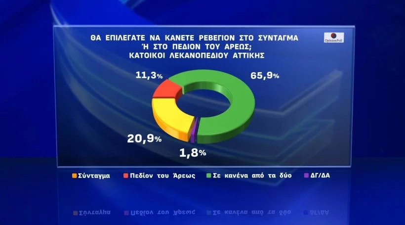 Τέλος, η πιο… δύσκολη ερώτηση αφορούσε το πού θα επιλέξουν οι Αθηναίοι να αλλάξουν χρόνο, μετά το ζήτημα που έχει προκύψει με το διπλό ρεβεγιόν σε Σύνταγμα και Πεδίον Άρεως. Το 65,9% απαντά «σε κανένα από τα δύο», με το Σύνταγμα να κερδίζει το Πεδίον του Άρεως, με 20,9% έναντι 11,3%.