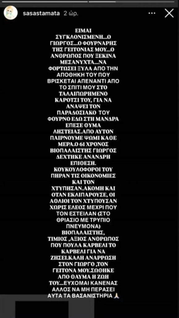 «Κουκουλοφόροι του πήραν τις οικονομίες και τον χτύπησαν. Ακόμη και όταν εκλιπαρούσε, οι άθλιοι τον χτυπούσαν χωρίς έλεος μέχρι που τον έστειλαν στο Θριάσιο με τρύπιο πνεύμονα. Βιοπαλαιστής, τίμιος, άξιος άνθρωπος που πουλά καρβέλι το καρβέλι για να ζήσει. Καλή ανάρρωση στον Γιώργο, τον γείτονά μου. Σώθηκε από θαύμα η ζωή του… Εύχομαι κανένας άλλος να μη περάσει αυτά τα βασανιστήρια», κατέληξε η Σάσα Σταμάτη.