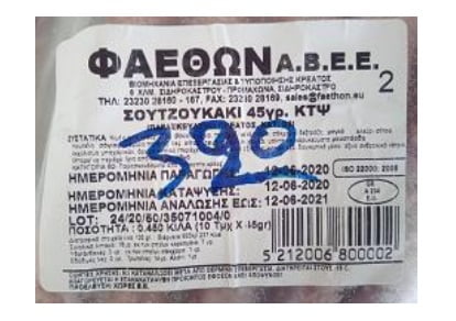 Ο Ε.Φ.Ε.Τ. και ειδικότερα η Περιφερειακή Διεύθυνση Κεντρικής Μακεδονίας, κατά τη διενέργεια ελέγχων στο πλαίσιο του Προγράμματος «Επίσημος Έλεγχος Μικροβιολογικών Κριτηρίων Ασφάλειας Τροφίμων» έτους 2020, προέβη σε δειγματοληψία παρασκευάσματος κρέατος με τα στοιχεία: ΣΟΥΤΖΟΥΚΑΚΙ 45 γρ. ΚΤΨ, αριθμού παρτίδας lot 24/20/50/35071004/0, με ημερομηνία ανάλωσης 12/06/2021 και ημερομηνία παραγωγής / κατάψυξης 12/06/2020, που παράγεται από την εταιρεία «ΦΑΕΘΩΝ Α.Β.Ε.Ε.» και σε συνεργασία με τα Εργαστήρια Δοκιμών και Ερευνών Τροφίμων Θεσσαλονίκης του Ε.Φ.Ε.Τ., διαπιστώθηκε η ΠΑΡΟΥΣΙΑ του παθογόνου μικροοργανισμού Salmonella spp. στο ανωτέρω δείγμα.