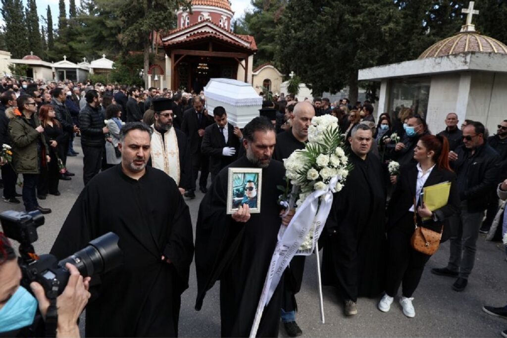 Οδύνη και σπαραγμός στο νεκροταφείο Καισαριανής για την κηδεία του 35χρονου μηχανοδηγού της εμπορικής αμαξοστοιχίας, Σπύρου Βούλγαρη, που έχασε τη ζωή του στα Τέμπη, μετά τη σύγκρουση με το Intercity.